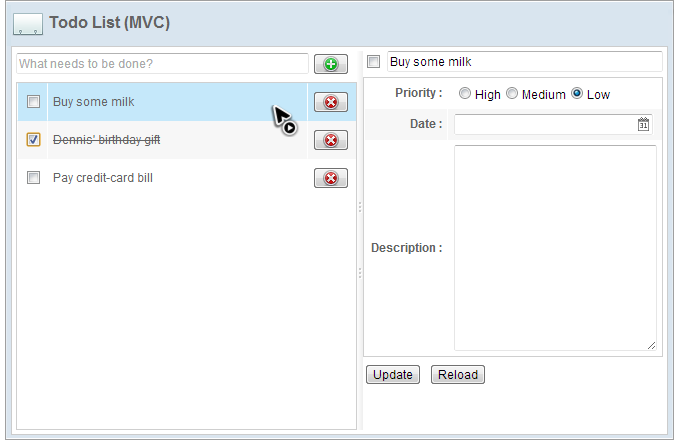 Click an existing item and the detail editor appears. Then you can edit the item's details.Delete a todo item.